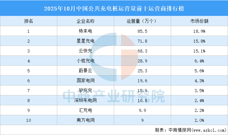 中商情報(bào)網(wǎng)訊:截至2025年10月底,我國(guó)電動(dòng)汽車公共充電設(shè)施(槍)453.3萬(wàn)個(gè),同比增長(zhǎng)39.5%。TOP10企業(yè)公共充電樁運(yùn)營(yíng)量合計(jì)345.0萬(wàn)個(gè),市場(chǎng)份額合計(jì)76.1%。