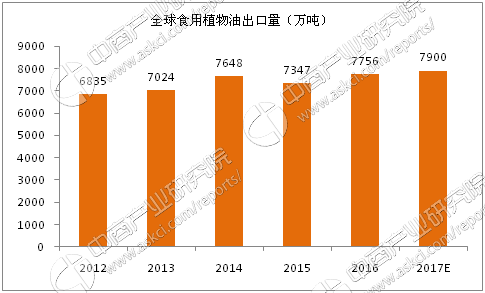2012年到2016年,全球食用植物油的出口量整體上呈穩(wěn)定增長的趨勢,全球食用植物油出口量年均復(fù)合增長率為3.2%,2016年全球食用植物油出口量突破7700萬噸,預(yù)計2017年全球食用植物油的出口量將近7900萬噸。