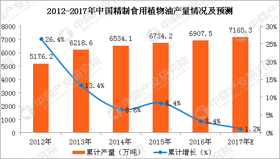 從近幾年精制食用植物油產(chǎn)量情況來看,基本保持著平穩(wěn)地態(tài)勢。2016年精制食用植物油累計產(chǎn)量為6907.5萬噸,累計增長3.4,;據(jù)中商產(chǎn)業(yè)研究院預測:2017年精制食用植物油累計產(chǎn)量將達7165.3萬噸。