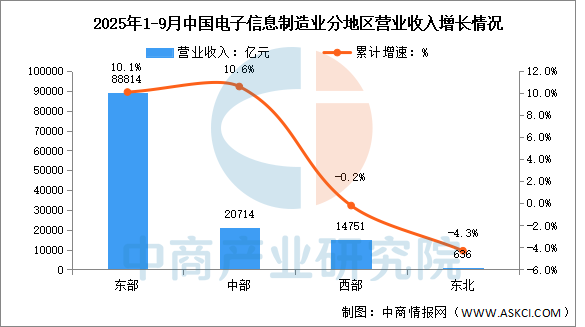 前三季度,規(guī)模以上電子信息制造業(yè)東部地區(qū)實現(xiàn)營業(yè)收入88814億元,同比增長10.1%,較1—8月回落0.1個百分點;中部地區(qū)實現(xiàn)營業(yè)收入20714億元,同比增長10.6%,較1—8月提高0.3個百分點;西部地區(qū)實現(xiàn)營業(yè)收入14751億元,同比下降0.2%,較1—8月提高0.3個百分點;東北地區(qū)實現(xiàn)營業(yè)收入636億元,同比下降4.3%,較1—8月提高0.9個百分點。9月份,東部地區(qū)實現(xiàn)營業(yè)收入11775億元,同比增長9.4%;中部地區(qū)實現(xiàn)營業(yè)收入3114億元,同比增長12.6%;西部地區(qū)實現(xiàn)營業(yè)收入1847億元,同比增長1.9%;東北地區(qū)實現(xiàn)營業(yè)收入79.1億元,同比增長2.1%。
