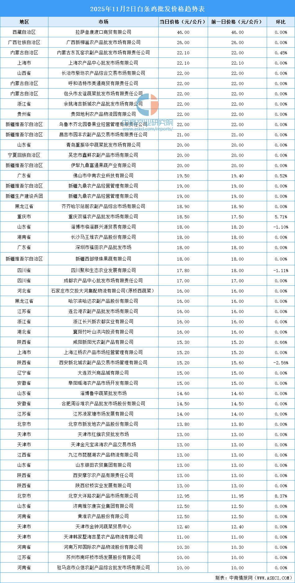 中商情報(bào)網(wǎng)訊:最新數(shù)據(jù)顯示:11月2日全國(guó)白條雞平均價(jià)格為17.23元/公斤。其中,白條雞價(jià)格最高的市場(chǎng)是拉薩叁康渡口商貿(mào)有限公司,當(dāng)日價(jià)格為46.00元/公斤,環(huán)比持平。白條雞價(jià)格最低的市場(chǎng)是蘇州市南環(huán)橋市場(chǎng)發(fā)展股份有限公司和駐馬店市眾信農(nóng)副產(chǎn)品綜合批發(fā)市場(chǎng)有限公司,當(dāng)日價(jià)格均為10.00元/公斤。