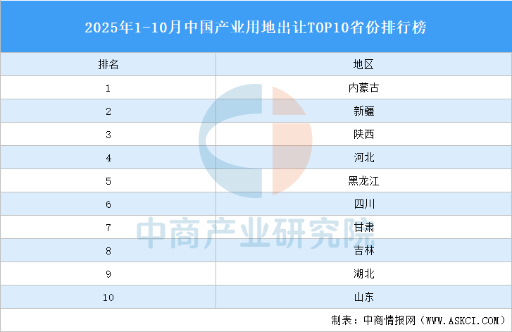 據(jù)中商產(chǎn)業(yè)研究院產(chǎn)業(yè)地產(chǎn)情報庫監(jiān)測數(shù)據(jù)顯示:2025年1-10月全國產(chǎn)業(yè)用地出讓TOP10省份排行榜已揭曉。據(jù)榜單顯示:內(nèi)蒙古、新疆、陜西、河北、黑龍江、四川、甘肅、吉林、湖北、山東產(chǎn)業(yè)用地出讓面積位列全國前十。
