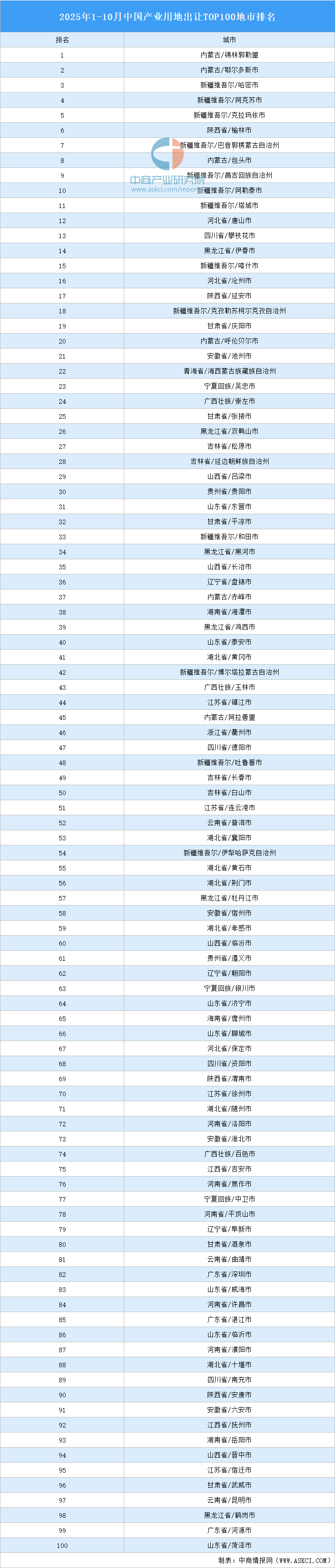 據(jù)中商產(chǎn)業(yè)研究院產(chǎn)業(yè)地產(chǎn)情報庫監(jiān)測數(shù)據(jù)顯示:2025年1-10月,全國產(chǎn)業(yè)用地出讓TOP100地市排行榜已揭曉。據(jù)榜單顯示:2025年1-10月我國產(chǎn)業(yè)用地出讓面積前十地市分別為:內(nèi)蒙古/錫林郭勒盟、內(nèi)蒙古/鄂爾多斯市、新疆維吾爾/哈密市、新疆維吾爾/阿克蘇市、新疆維吾爾/克拉瑪依市、陜西省/榆林市、新疆維吾爾/巴音郭楞蒙古自治州、內(nèi)蒙古/包頭市、新疆維吾爾/昌吉回族自治州、新疆維吾爾/阿勒泰市。