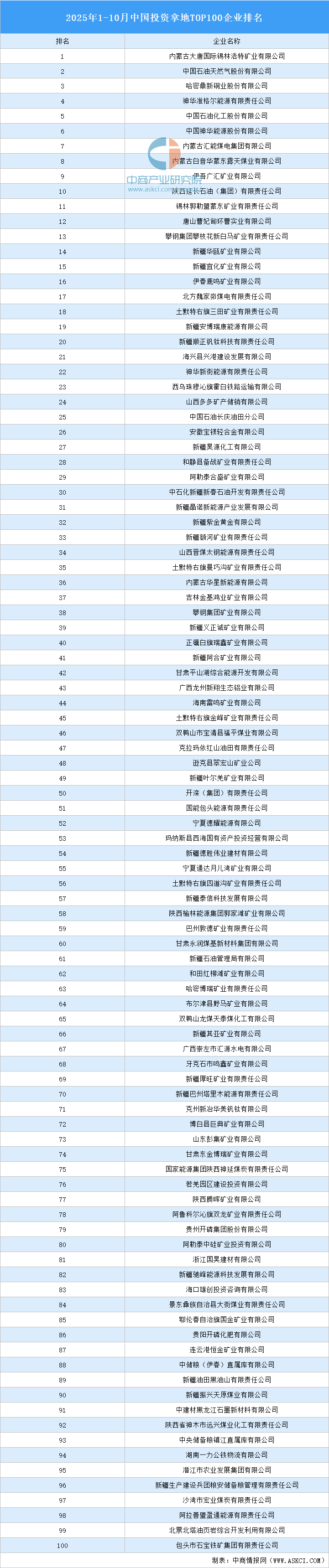 據(jù)中商產(chǎn)業(yè)研究院產(chǎn)業(yè)地產(chǎn)情報(bào)庫(kù)監(jiān)測(cè)數(shù)據(jù)顯示:2025年1-10月全國(guó)投資拿地TOP100企業(yè)排行榜已揭曉。榜單顯示,2025年1-10月我國(guó)投資拿地前十企業(yè)分別為:內(nèi)蒙古大唐國(guó)際錫林浩特礦業(yè)有限公司、中國(guó)石油天然氣股份有限公司、哈密鼎新銅業(yè)股份有限公司、神華準(zhǔn)格爾能源有限責(zé)任公司、中國(guó)石油化工股份有限公司、中國(guó)神華能源股份有限公司、內(nèi)蒙古匯能煤電集團(tuán)有限公司、內(nèi)蒙古白音華蒙東露天煤業(yè)有限公司、伊吾廣匯礦業(yè)有限公司、陜西延長(zhǎng)石油(集團(tuán))有限責(zé)任公司。