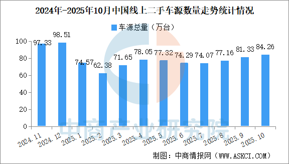 中商情報(bào)網(wǎng)訊:在車市“金九銀十”的熱潮中,二手車處置的數(shù)量持續(xù)提高,車源量環(huán)比增長(zhǎng)。2025年10月,線上二手車源量84.26萬臺(tái),環(huán)比增長(zhǎng)3.6%,同比減少6.2%。