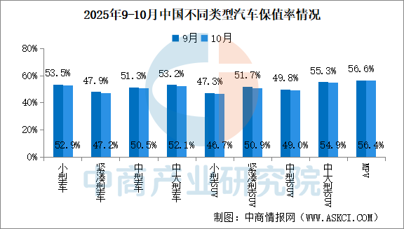 2025年10月,各級(jí)別車型保值率下降。小型車的保值率較高,與價(jià)格最高的中大型SUV/MPV保值率接近。