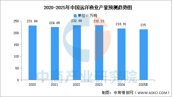近年來,我國嚴格控制遠洋漁業(yè)規(guī)模,堅持遠洋漁船數(shù)量控制在3000艘以內、遠洋漁業(yè)總產量控制在230萬噸左右的目標。中商產業(yè)研究發(fā)布的《2025-2030年中國海洋漁業(yè)深度分析及產業(yè)發(fā)展風險研究預測報告》顯示,2024年,全國遠洋漁業(yè)產量218.91萬噸,同比下降5.74%,占水產品總產量的2.98%。中商產業(yè)研究院分析師預測,2025年全國遠洋漁業(yè)產量將繼續(xù)下降到215萬噸。
