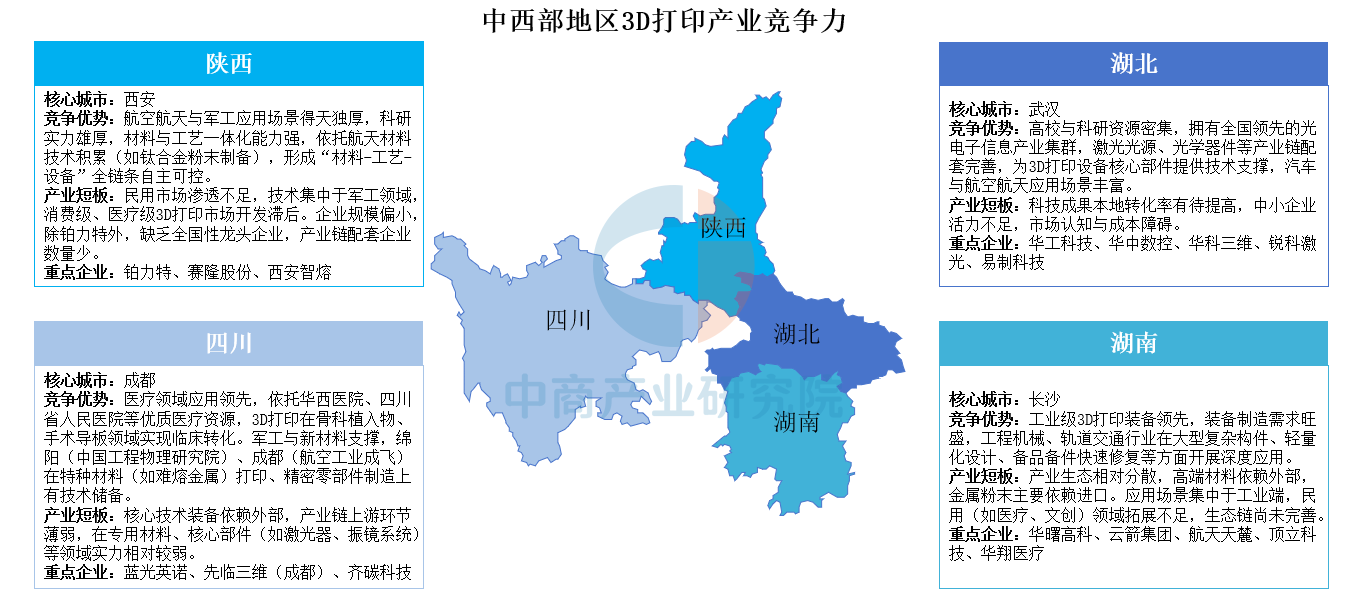 中西部地區(qū)3D打印產(chǎn)業(yè)依托核心城市形成差異化發(fā)展格局:湖北以高??蒲匈Y源密集、光電子信息產(chǎn)業(yè)集群及汽車/航空航天應(yīng)用場景為優(yōu)勢,激光光源等核心部件技術(shù)支撐強,但面臨科技成果轉(zhuǎn)化率低、中小企業(yè)活力不足等短板;湖南工業(yè)級裝備領(lǐng)先,裝備制造需求旺盛,工程機(jī)械、軌道交通領(lǐng)域深度應(yīng)用大型復(fù)雜構(gòu)件等技術(shù),卻存在產(chǎn)業(yè)生態(tài)分散、高端材料依賴進(jìn)口、民用領(lǐng)域拓展不足等問題;陜西憑借航空航天軍工場景優(yōu)勢及材料-工藝-設(shè)備全鏈條自主可控能力(如鈦合金粉末制備)領(lǐng)跑,但民用市場滲透滯后、企業(yè)規(guī)模偏小且產(chǎn)業(yè)鏈配套少;四川醫(yī)療應(yīng)用領(lǐng)先,依托華西醫(yī)院等資源實現(xiàn)骨科植入物等臨床轉(zhuǎn)化,軍工與新材料支撐特種材料打印等技術(shù)儲備,然而核心技術(shù)裝備依賴外部、產(chǎn)業(yè)鏈上游薄弱。