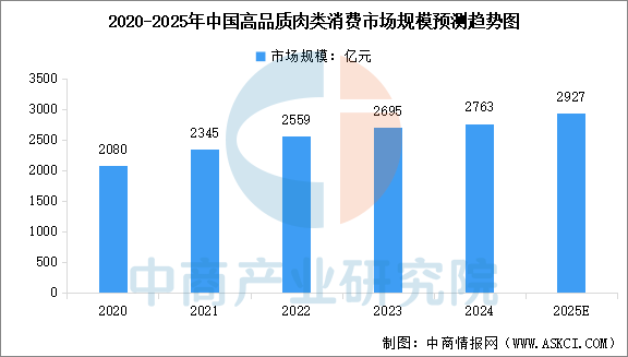 高品質肉類消費市場通常指以規(guī)?;?、品牌化和標準化生產為特征,能夠在食品安全、口感質量及營養(yǎng)價值上滿足消費者更高需求的肉類消費市場。目前,中國高品質肉類在整體肉類消費中的占比仍低于歐美等發(fā)達市場。中商產業(yè)研究院發(fā)布的《2025-2030年中國肉制品行業(yè)前景預測與市場調查研究報告》顯示,2024年中國高品質肉類消費市場規(guī)模達到2763億元,較上年增長2.52%。中商產業(yè)研究院分析師預測,2025年中國高品質肉類消費市場規(guī)模將達到2927億元。