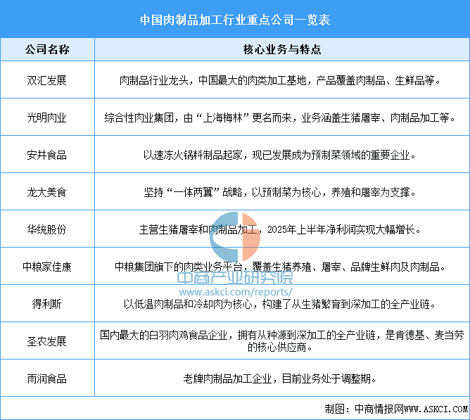 當前中國肉制品加工行業(yè)已形成以雙匯發(fā)展為龍頭,多家百億級企業(yè)并存的格局。其中,光明肉業(yè)、中糧家佳康在生豬屠宰與加工領域占據重要份額,圣農發(fā)展則主導禽肉細分市場,龍大美食、得利斯等企業(yè)正積極向預制菜和低溫肉制品等高增長領域加速轉型。