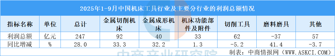 2025年1-9月,機(jī)床工具行業(yè)實(shí)現(xiàn)利潤(rùn)總額247億元,同比增長(zhǎng)28.0%,結(jié)束自2023年上半年以來的下行趨勢(shì),重回增長(zhǎng)區(qū)間。主要分行業(yè)中,金屬切削機(jī)床和金屬成形機(jī)床分行業(yè)繼續(xù)保持增長(zhǎng),機(jī)床功能部件及附件分行業(yè)由上半年同比下降0.4%恢復(fù)到同比增長(zhǎng)1.3%,磨料磨具分行業(yè)的虧損額由上半年的79億元降至37億元。