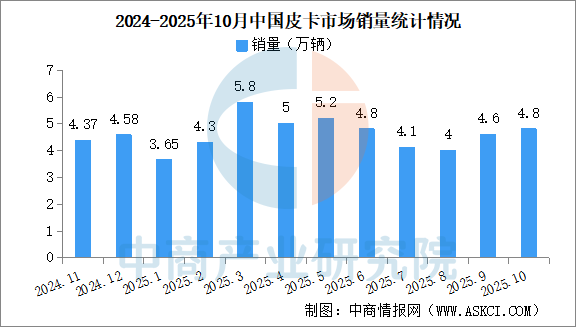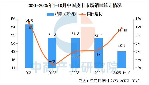 中商情報(bào)網(wǎng)訊:2025年10月份皮卡市場銷售為4.8萬輛,同比增長12%,環(huán)比增長5.5%,處于近5年的中高位水平。2025年1-10月份皮卡市場銷售48.1萬輛,同比增長11.4%。