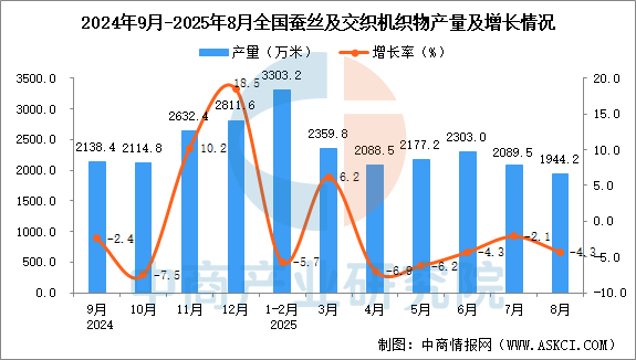 2025年8月全國蠶絲及交織機(jī)織物產(chǎn)量增長情況