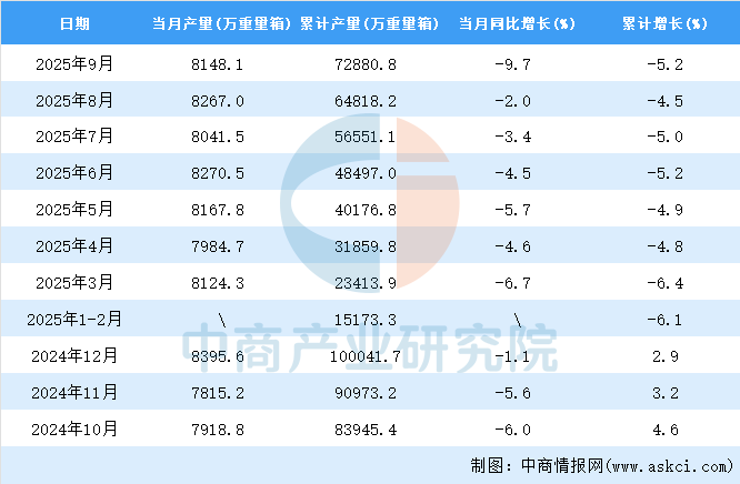 中商情報(bào)網(wǎng)訊:據(jù)中商產(chǎn)業(yè)研究院數(shù)據(jù)庫,2025年9月全國平板玻璃當(dāng)月產(chǎn)量與去年同期相比下降。2025年9月全國平板玻璃產(chǎn)量為8148.1萬重量箱,同比下降9.7%。2025年1-9月全國平板玻璃產(chǎn)量72880.8萬重量箱,同比下降5.2%。