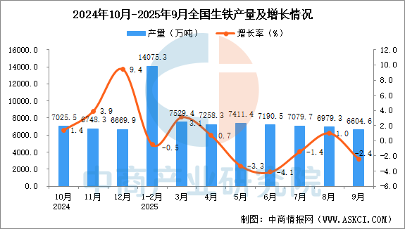 中商情報(bào)網(wǎng)訊:據(jù)中商產(chǎn)業(yè)研究院數(shù)據(jù)庫,2025年9月全國生鐵當(dāng)月產(chǎn)量與去年同期相比下降。2025年9月全國生鐵產(chǎn)量為6604.6萬噸,同比下降2.4%。2025年1-9月全國生鐵產(chǎn)量64586.2萬噸,同比下降1.1%。