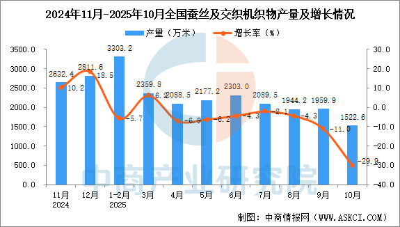 2025年10月全國蠶絲及交織機織物產(chǎn)量增長情況