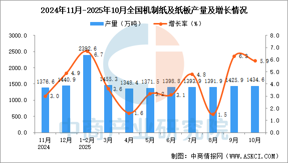 2025年10月全國(guó)機(jī)制紙及紙板產(chǎn)量增長(zhǎng)情況