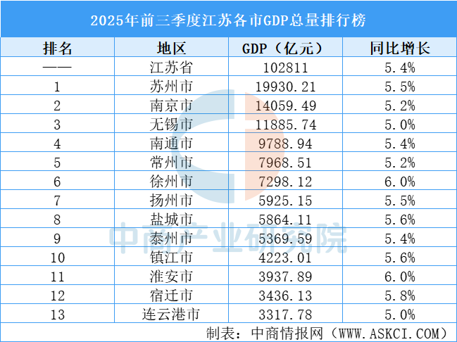 2025年前三季度江蘇各市GDP排行榜:蘇州GDP總量最高(圖)