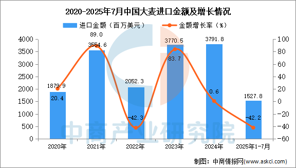 2025年7月中國大麥進(jìn)口量及金額增長情況