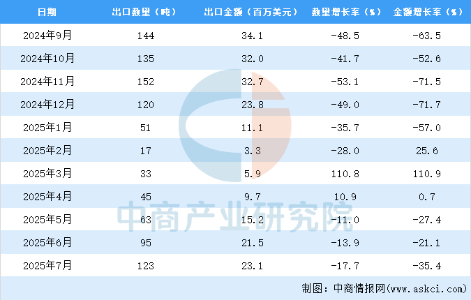 2025年7月中國裘皮服裝出口量及金額增長情況