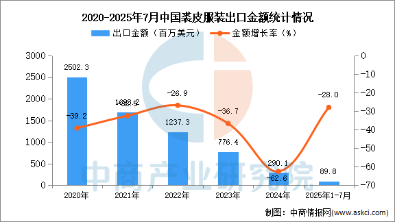 從金額方面來看,數(shù)據(jù)顯示,2025年1-7月中國裘皮服裝出口金額89.8百萬美元,同比下降28%。
