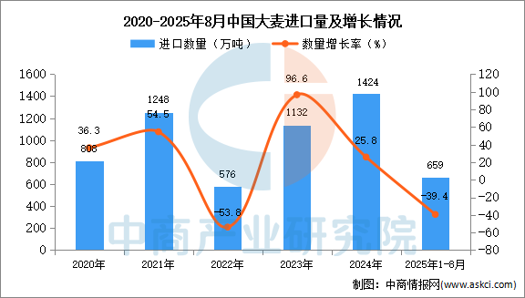 2025年8月中國大麥進(jìn)口量及金額增長情況