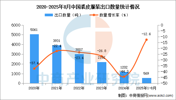 中商情報(bào)網(wǎng)訊:據(jù)中商產(chǎn)業(yè)研究院數(shù)據(jù)庫顯示,2024年我國裘皮服裝出口量1202噸,同比下降44.3%。最新數(shù)據(jù)顯示,2025年1-8月中國裘皮服裝出口量569噸,同比下降12.6%。