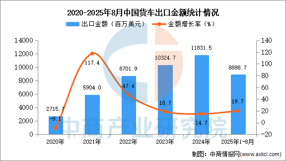從金額方面來看,數(shù)據(jù)顯示,2025年1-8月中國貨車出口金額8898.7百萬美元,同比增長19.7%。