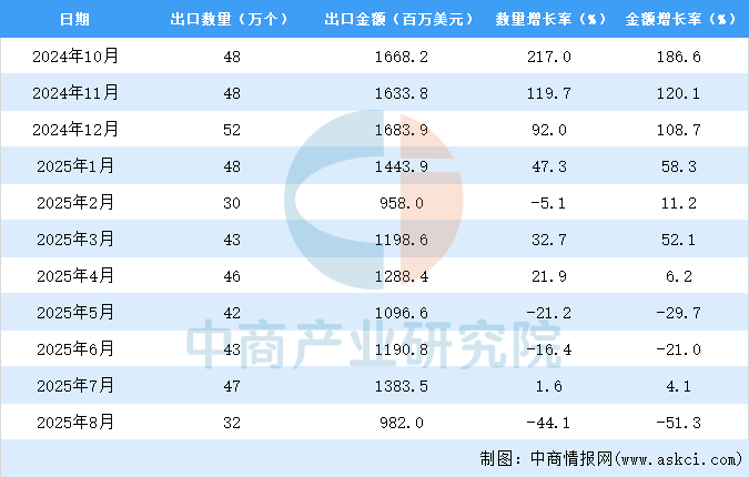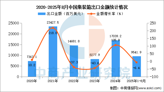 2025年8月中國集裝箱出口量及金額增長情況