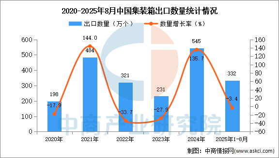 2025年1-8月中國集裝箱出口數(shù)據(jù)統(tǒng)計(jì)分析:出口量同比下降3.4%