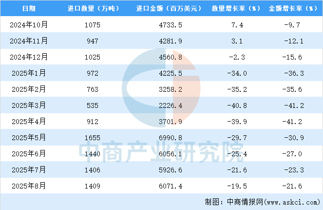 2025年9月中國(guó)糧食進(jìn)口量及金額增長(zhǎng)情況