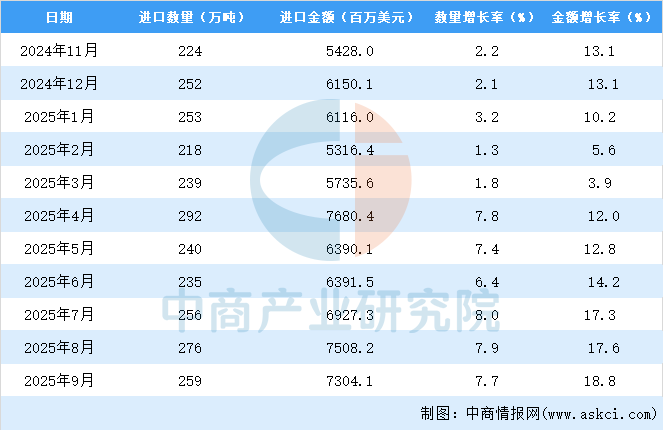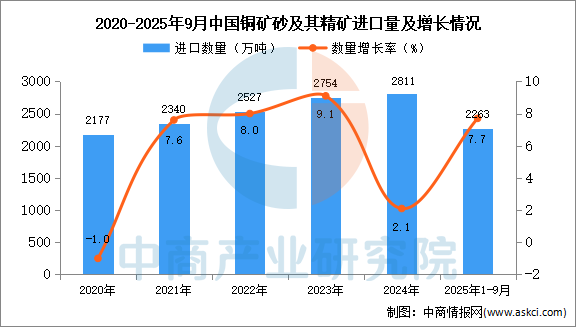2025年9月中國(guó)銅礦砂及其精礦進(jìn)口量及金額增長(zhǎng)情況