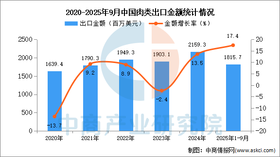 從金額方面來看,數(shù)據(jù)顯示,2025年1-9月中國肉類(包括雜碎)出口金額1815.7百萬美元,同比增長17.4%。