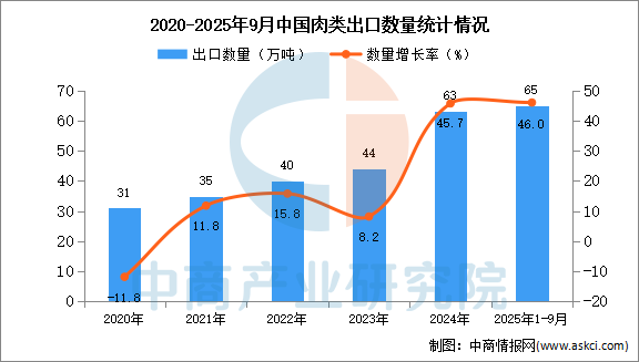 2025年9月中國肉類(包括雜碎)出口量及金額增長情況