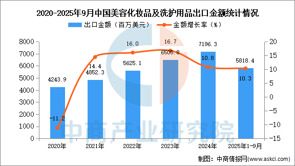 2025年9月中國美容化妝品及洗護(hù)用品出口量及金額增長情況