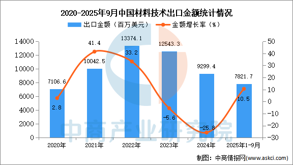 從金額方面來看,數(shù)據(jù)顯示,2025年1-9月中國材料技術(shù)出口金額7821.7百萬美元,同比增長10.5%。