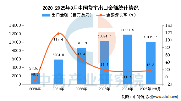 從金額方面來看,數(shù)據(jù)顯示,2025年1-9月中國貨車出口金額10112.7百萬美元,同比增長16.3%。