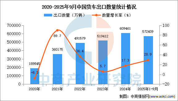 2025年9月中國貨車出口量及金額增長情況