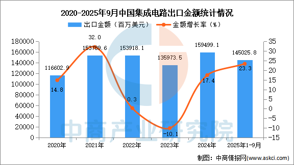 從金額方面來看,數(shù)據(jù)顯示,2025年1-9月中國集成電路出口金額145025.8百萬美元,同比增長23.3%。