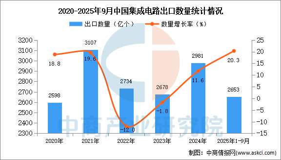 中商情報網(wǎng)訊:據(jù)中商產(chǎn)業(yè)研究院數(shù)據(jù)庫顯示,2024年中國集成電路出口量2981億個,同比增長11.6%。最新數(shù)據(jù)顯示,2025年1-9月中國集成電路出口量2653億個,同比增長20.3%。