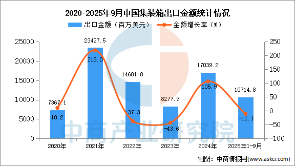 從金額方面來看,數(shù)據(jù)顯示,2025年1-9月中國集裝箱出口金額10714.8百萬美元,同比下降11.1%。