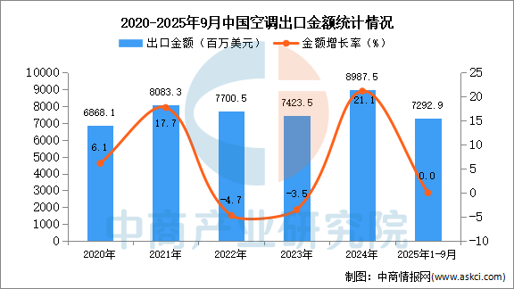 從金額方面來看,數(shù)據(jù)顯示,2025年1-9月中國空調(diào)出口金額7292.9百萬美元,同比增長持平。