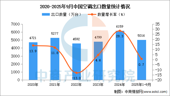 中商情報網(wǎng)訊:據(jù)中商產(chǎn)業(yè)研究院數(shù)據(jù)庫顯示,2024年中國空調(diào)出口量6159萬臺,同比增長28.3%。最新數(shù)據(jù)顯示,2025年1-9月中國空調(diào)出口量5016萬臺,同比增長0.7%。