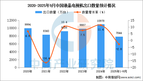 中商情報(bào)網(wǎng)訊:據(jù)中商產(chǎn)業(yè)研究院數(shù)據(jù)庫顯示,2024年中國液晶電視機(jī)出口量10978萬臺(tái),同比增長11.4%。最新數(shù)據(jù)顯示,2025年1-9月中國液晶電視機(jī)出口量7844萬臺(tái),同比下降2.8%。