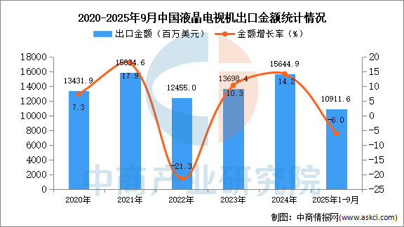 從金額方面來看,數(shù)據(jù)顯示,2025年1-9月中國液晶電視機(jī)出口金額10911.6百萬美元,同比下降6%。