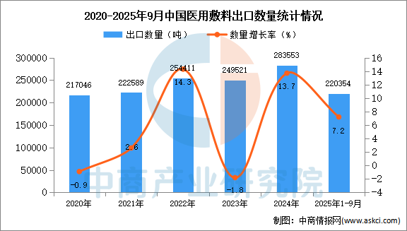 中商情報(bào)網(wǎng)訊:據(jù)中商產(chǎn)業(yè)研究院數(shù)據(jù)庫顯示,2024年我國(guó)醫(yī)用敷料出口量283553噸,同比增長(zhǎng)13.7%。最新數(shù)據(jù)顯示,2025年1-9月中國(guó)醫(yī)用敷料出口量220354噸,同比增長(zhǎng)7.2%。