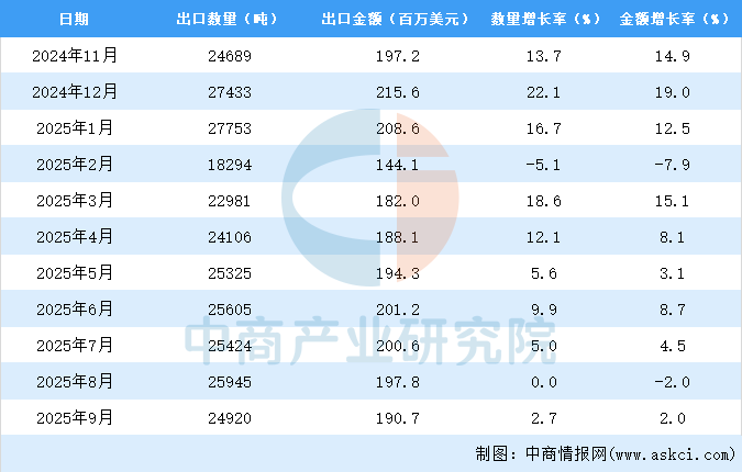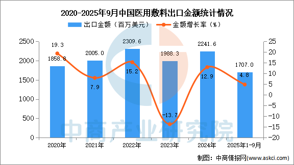 2025年9月中國(guó)醫(yī)用敷料出口量及金額增長(zhǎng)情況