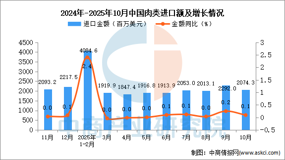 2025年10月中國肉類(包括雜碎)進(jìn)口量及金額增長(zhǎng)情況