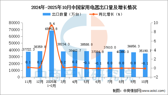 中商情報網(wǎng)訊:據(jù)中商產(chǎn)業(yè)研究院數(shù)據(jù)庫顯示,2025年10月中國家用電器出口量35190.7萬臺,同比下降0.1%;1-10月中國家用電器出口量371163.2萬臺,同比下降0.3%。