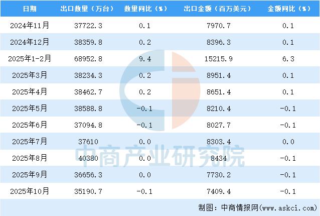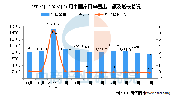 從金額方面來看,2025年10月中國家用電器出口金額7409.4百萬美元,同比下降0.1%;1-10月中國家用電器出口金額80915.9百萬美元,同比下降3.4%。